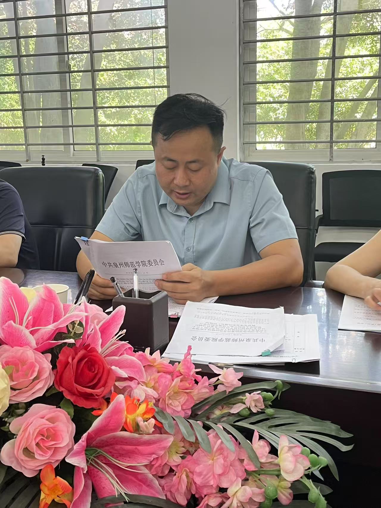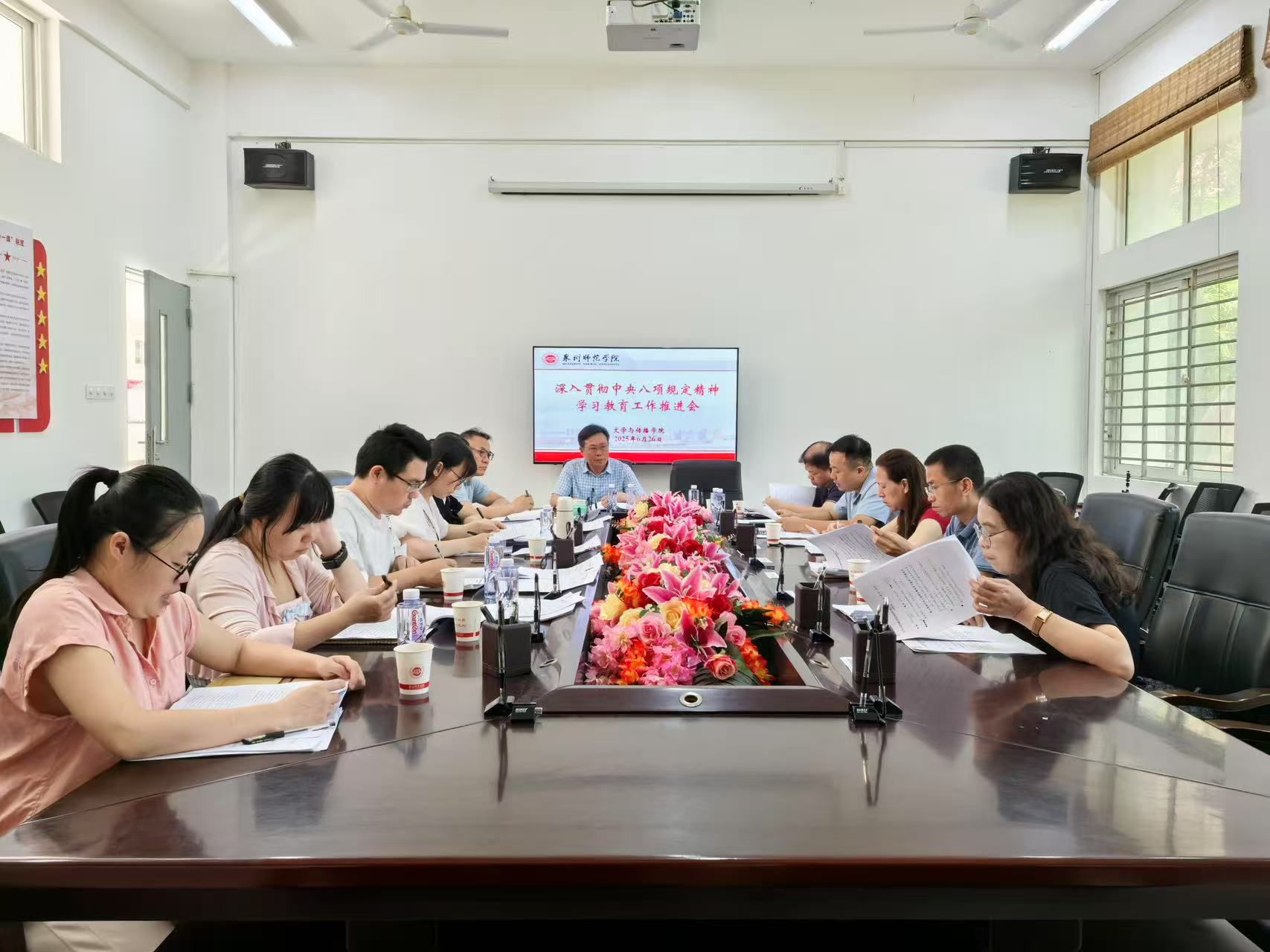 6月27日上午,文学与传播学院在俊秀东楼112会议室召开深入贯彻中央八项规定精神学习教育工作推进会。学院党委委员、各党支部书记、三办负责人参加,会议由学院党委书记林建全主持。