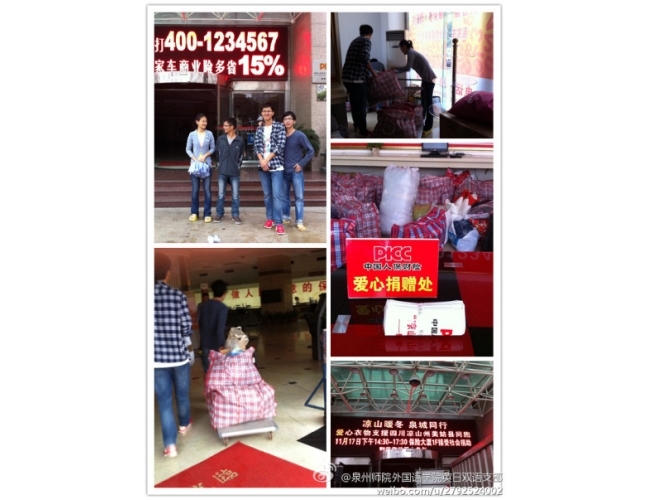英日双语专业学生党支部此次共派出五名党员及入党积极分子前往。记者注意到,虽然正式的捐献时间是下午2点半,可是一大早,前去捐献的人陆陆续续将衣物堆满了人保公司的大厅。市民们将所要捐的衣物整齐叠好,堆放得井然有序。据此次活动的负责人施晓祺介绍,本次是他们公司联合泉州889新闻广播“政风行风热线”栏目组举办的首次捐衣活动,活动初期在微博上宣传了近2周的时间,且反响不错。对于学校的参与度问题,他表示,泉州师院和华侨大学一直以来是他们公司举办各种活动的主力军,如果此次活动效果比较好,他们会考虑到学校进行大力宣传。对于我们所关心的寄去哪里和邮递费用问题,施晓祺解释道,他们会将此次收集到的衣物进行分类整理,然后交给专门的机构进行消毒,最后寄往四川省红十字会,其中的费用由他们和889新闻广播电台全程负责。