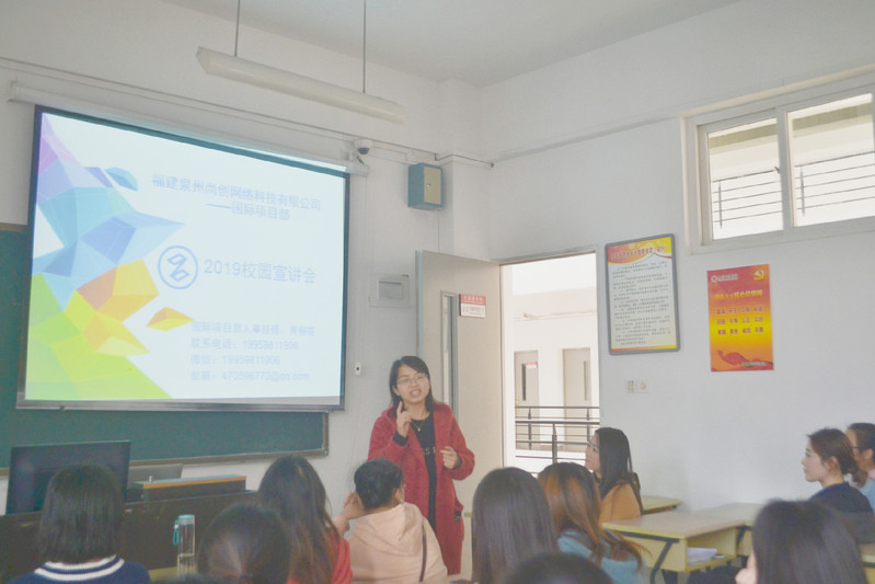 2019年12月12日下午3时许,泉州尚创网络科技股份有限公司国际项目部的校园宣讲招聘会在我院外文楼310教室如期举行。此次宣讲会由泉州尚创科技股份有限公司的福建区总经理袁军以及人事部经理黄柳花女士主讲,我院2016级毕业生参加此次宣讲会。