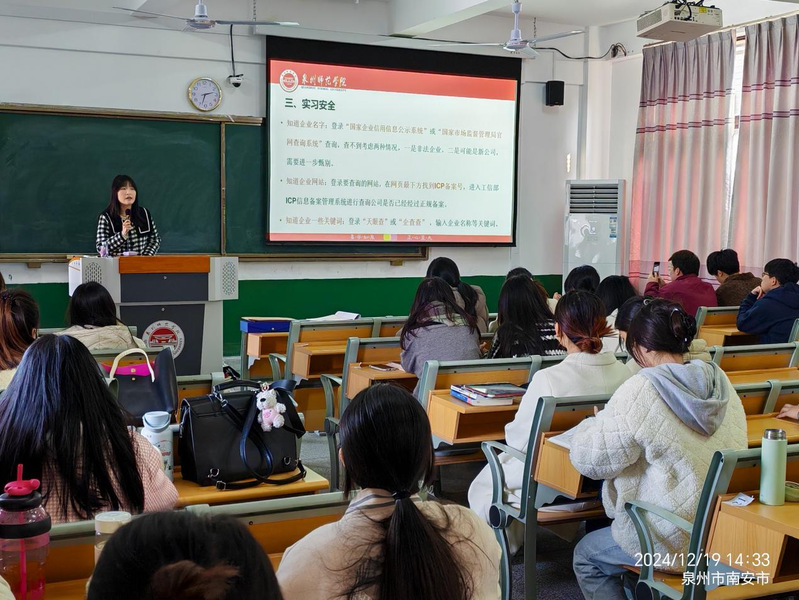 陈彩蓉老师着重就毕业实习安全问题进行了深入讲解。她指导学生如何通过多种渠道查询实习企业信息,确保实习单位的合法性和正规性,如利用“国家企业信用信息公示系统”“国家市场监督管理总局官网查询系统”“天眼查”“企查查”等平台进行全面了解。陈老师还结合实际案例,提醒同学们在实习期间要时刻保持安全意识,遇到问题及时与学校和相关部门取得联系,保障自身安全。