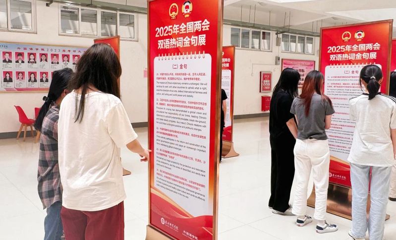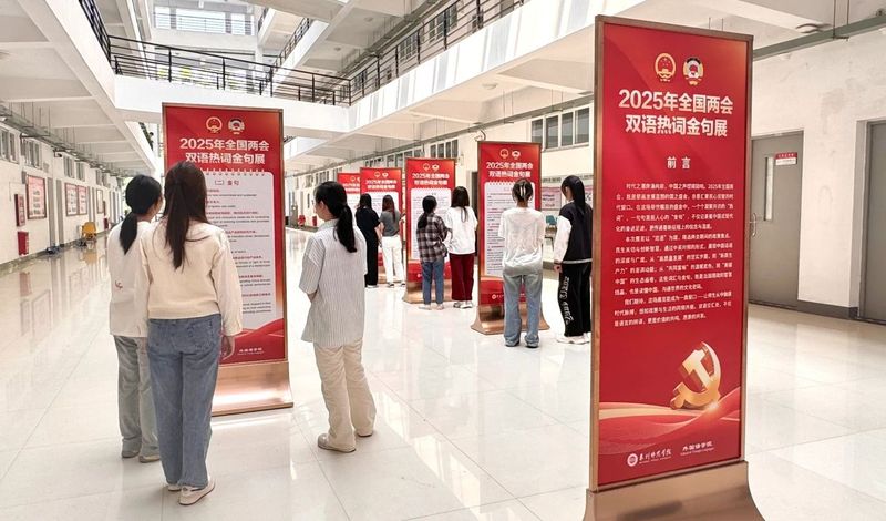 2025年4月下旬起,外国语学院在外文楼二楼举办2025年全国两会双语热词金句展。展览是学校“书香激扬青春”读书月系列活动之一。