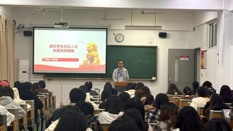 班会上,主讲人围绕国家发展与国防建设新形势展开宣讲,系统解读了大学生参军入伍的政策条件、流程规范及优待措施,着重强调了新时代青年的使命担当。