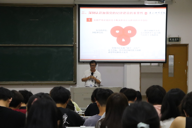 为进一步增强学生党员与学生骨干的政治纪律和政治规矩,推动党纪学习教育走深走实,2024年6月13日下午,我院党委副书记兼纪委书记洪荣文在理工218教室为学生上题为“以严明的纪律推动全面从严治党向纵深发展”的党纪学习教育专题党课。