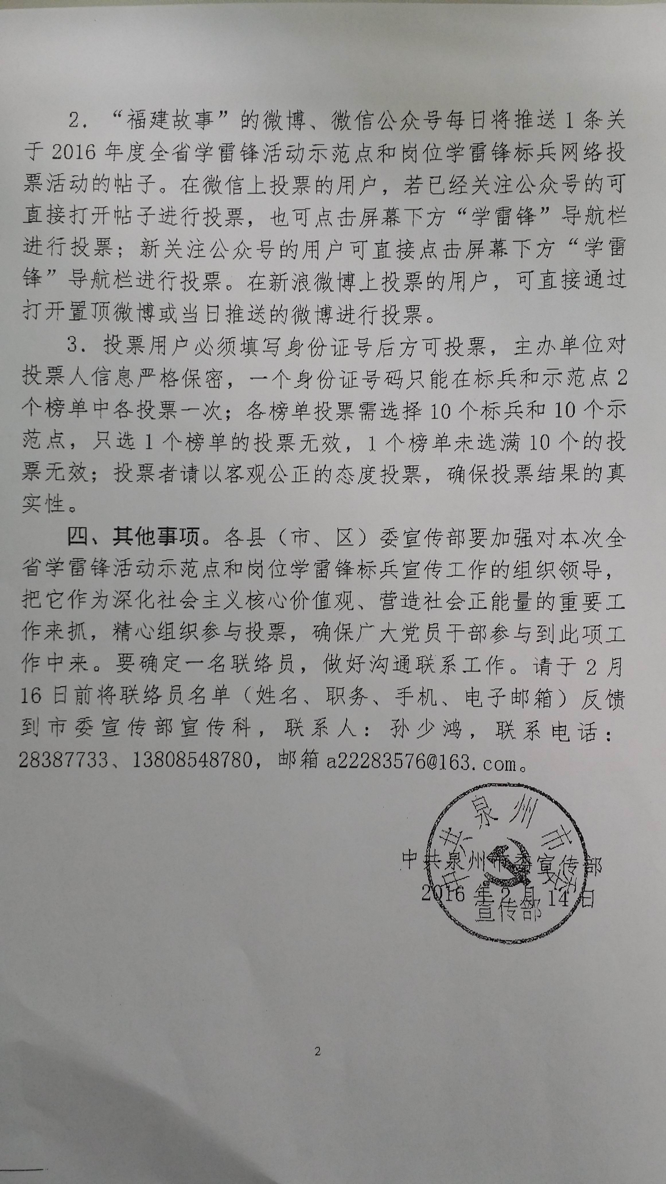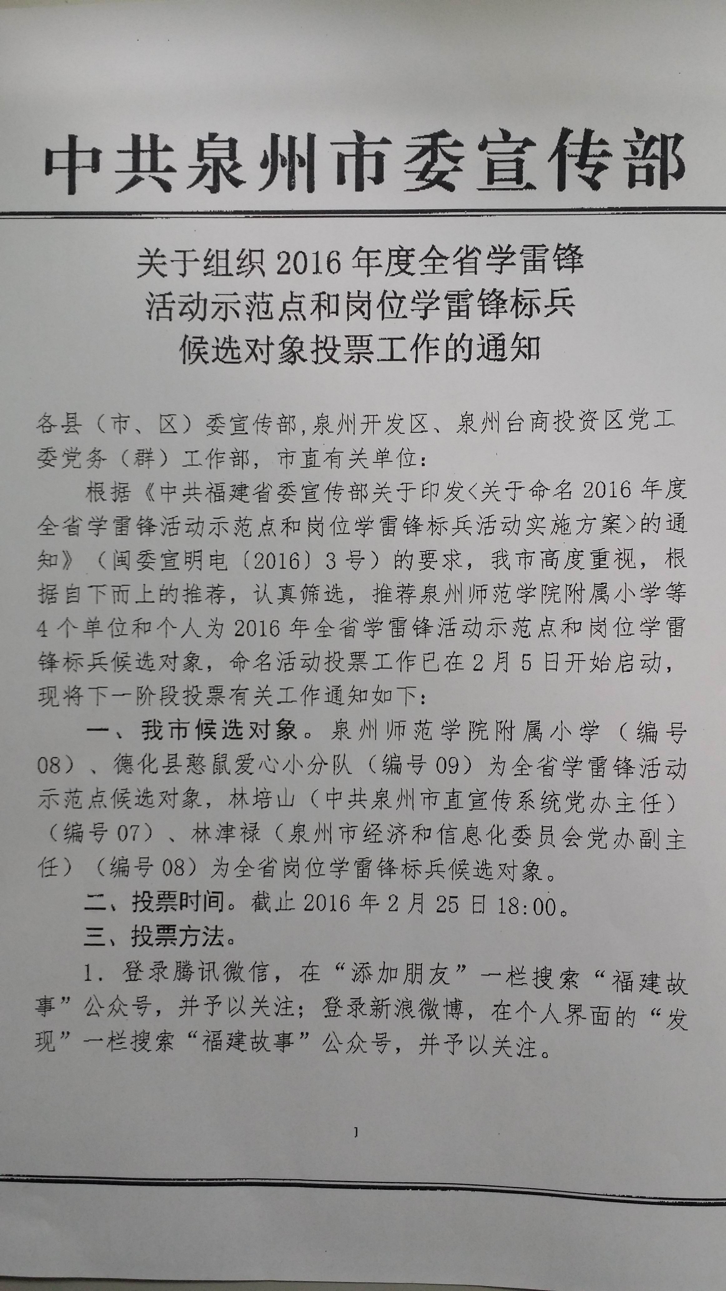 宣传部转发市委宣传部关于组织2016年度全省学雷锋活动示范点和岗位学雷锋标兵候选对象投票工作的通知