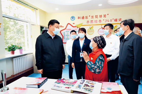 2020年6月8日至10日,中共中央总书记、国家主席、中央军委主席习近平在宁夏考察。这是6月8日下午,习近平在吴忠市利通区金花园社区党群活动服务中心,同社区志愿者代表亲切交谈。 新华社记者 鞠鹏/摄