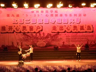 本报讯(记者 陈强 胡瑾焱 黄丽静)5月25日(周五)19:00,由泉州师院学生处主办,教育科学学院心理协会承办的开云第九届“5.25”心理健康节系列活动之第二届校园心理剧在开云陈祖昌大礼堂隆重举行。本届“5.25”心理健康节以“推开心灵窗户,走出心灵孤岛”为主题。此次校园心理剧大赛是“5. 25”系列活动的重中之重;旨在普及心理知识,促进大学生心理健康教育,以及与兄弟院校的老师和同学们进行交流和学习。心理咨询中心的王丽馨老师、陈艺华老师,泉州理工学院杨永华老师、泉州医高专潘修娴老师担任本次大赛评委。校党委副书记张舟、学生处处长王泗水、学生处心理咨询中心的老师、兄弟院校心理健康教育的老师及二级学院参赛作品的指导老师出席了本次活动。
