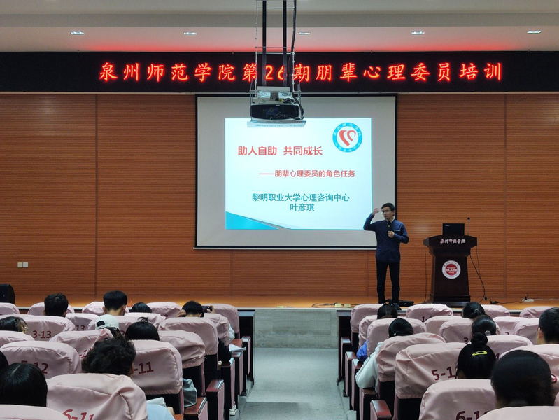 本次培训邀请泉州神和医院陈元堂博士、黎明职业大学叶彦琪及泉州幼高专潘芬芬三位老师,为2018级、2019级各学院心理联络员、班级心理委员及学生心理社团骨干成员做培训。