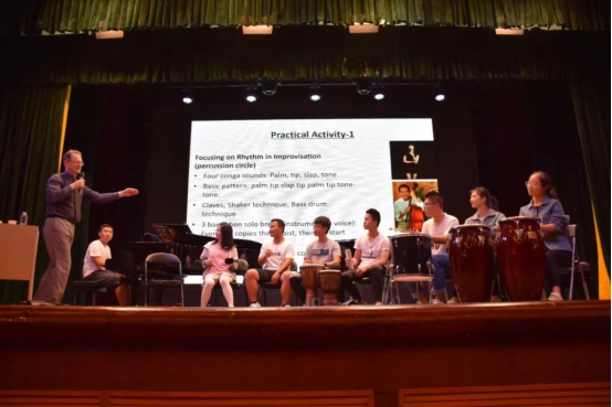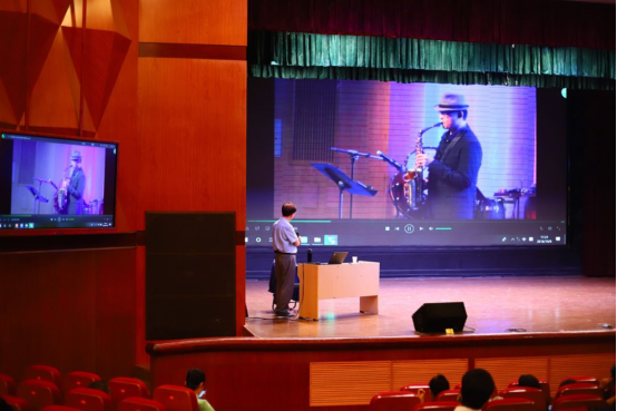 8日下午,分别进行两场学术讲座。第一场是来自David G. Hebert教授题为《音乐即兴表演的重要性及其学习方法》的讲座。他以其一种轻松、愉悦的互动方式,向学院师生阐明即兴表演对于音乐家发展、音乐灵感的产生、音乐领域合作的多元化等方面的重要性,提出节奏变化、音程/音色变化、音高转换、音乐休止长短的变化等为即兴表演的关键点,并与同学们进行现场实践演示。指导学生如何即兴表演与实践训练,展现其独特的教学方式与个人魅力。