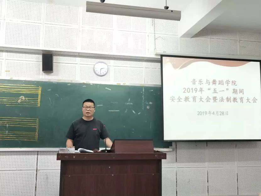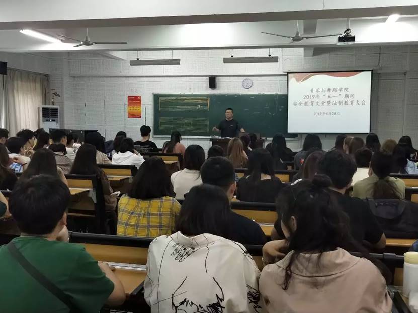 “五一”假期即将来临,为了确保同学们假期安全,增强同学们的安全意识,2019年4月28日下午,音乐与舞蹈学院学工办于E101举办“五一”期间安全教育大会暨法制教育大会,会议由院学工办副主任刘晓莹老师主持,院党委蒋双霖书记、院学工办朱思老师、学院全体学生主干参加会议。