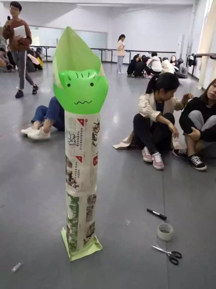 游戏开始前教练将参加人员分为了4个小队,每队发放了一张报纸、一张手工纸、一个心形气球、两把剪刀和一个胶带,每队需要利用这些材料工具在15分钟内制作属于自己队伍的灯塔,并由教练随机挑选队员对灯塔进行讲解,再由队长进行补充。