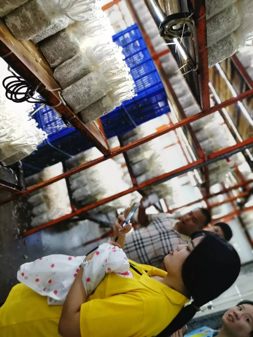 队员们了解到吴记生物开发有限公司的主营项目是培育销售海鲜菇,实践队在公司负责人的带领下参观了海鲜菇生产流程,参观了培养房、出菇房、打包房等地点,经吴经理介绍,了解到海鲜菇的生产需要经过备料、装瓶、灭菌、接种、入培养房、搔菌、入出菇房、采收八道工序最后才能打包入库送往销售市场。吴记生产海鲜菇与传统的蘑菇大棚不同,吴记积极进行科技转型升级,从而使从菌种培育到包装储藏流程上大体都实现了机械化、一体化。