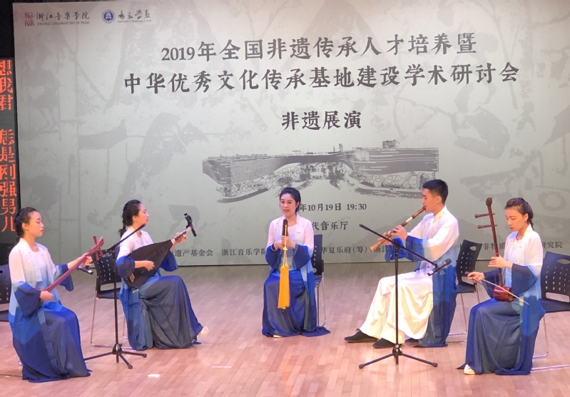 10月18日至20日,由中国华夏文化遗产基金、浙江音乐学院主办的2019年全国非遗传承人才培养暨中华优秀文化传承基地建设学术研讨会在浙江音乐学院隆重举行。