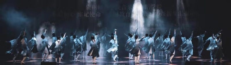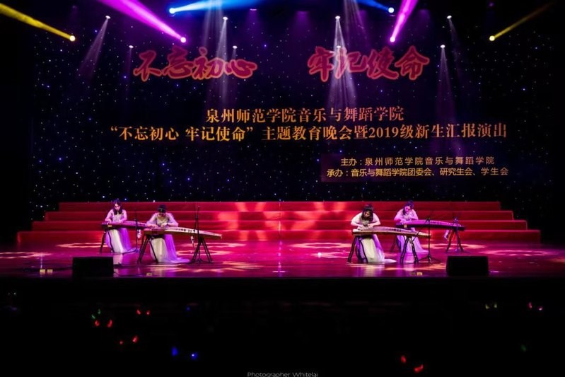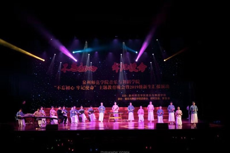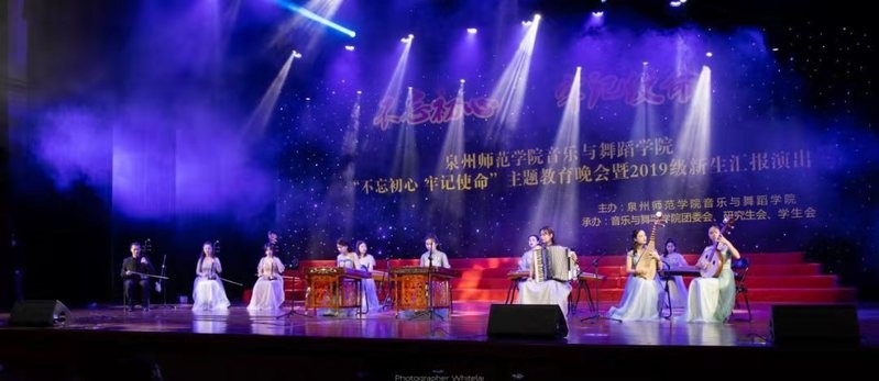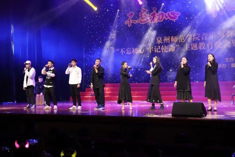 由2019级音乐学张欣霖、2019级音乐学(南音方向)吴霜霜、2019级音乐学(闽台方向)石卓楠等同学表演的朗诵《奋进新时代 谱写新篇章》,表达的不仅仅是对泉州飞速发展的自豪和中国少年的志气,更是对祖国母亲深深的热爱。