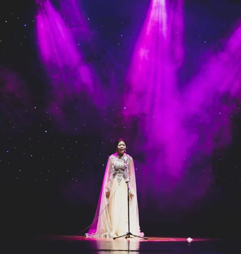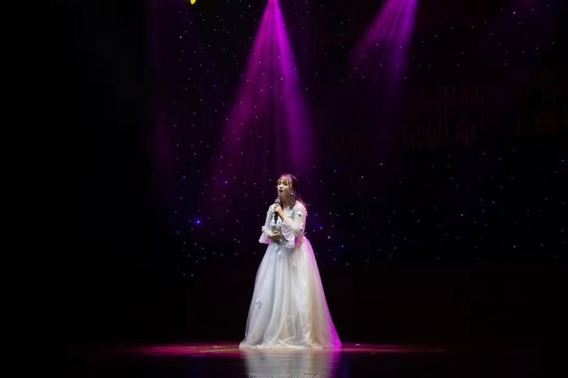 金炉香冷空罗帷,百花亭前月低垂。鸳鸯戏水成双对,千姿百媚比不上人间真情贵。2019级声乐演唱方向艺术硕士陈白萍带来了美妙的独唱《贵妃醉酒》,这首作品借鉴了传统戏曲中的润腔因素,极具古风雅韵,表达了杨贵妃的思恋、愁苦之情。