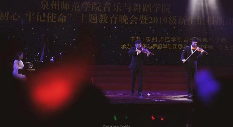 由2019级音乐学郑翰杰,2019级音乐学(闽台方向)温悦妍,谢永霖带来的小提琴二重奏《一步之遥》、《卡门》,用华丽而有气势的演奏展现了高难度的技巧,与钢琴完美的契合,让人沉醉不已。