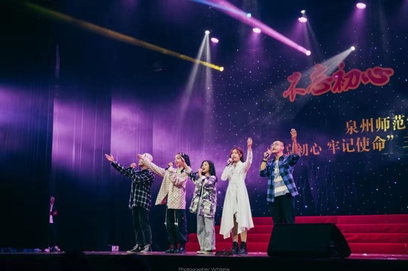 由2019级音乐学范文婷、郑岚卿,2019级音乐学(闽台方向)严源、杨柏青等同学带来的《新的天地》、《飘向北方》等流行歌曲串烧将现场的气氛带到高潮,出色的表演得到了同学们热烈的欢呼声和掌声。