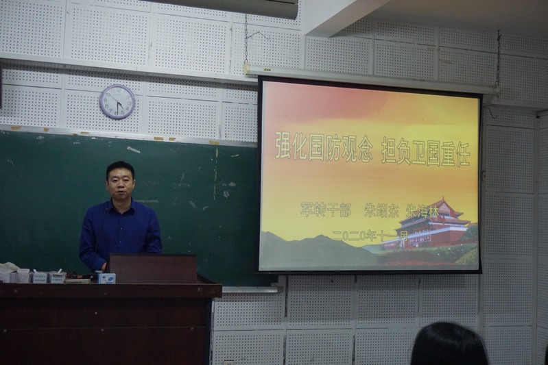 在艺术楼E101教室,朱绍东作了《强化国防观念 担负卫国重任》的主题报告,他向同学们介绍了国防观念的涵义特征、国防建设的重大意、国防事业的使命担当,他形象指出,军事实力是“脊梁骨”,决定着这个国家能否“抬起头”、“挺起胸”。大学生是国防建设、社会建设的生力军,每个大学生都要义不容辞的承担国防责任,希望同学们能够努力学习,增长本领,将来为建设强大国防贡献力量。