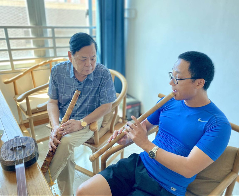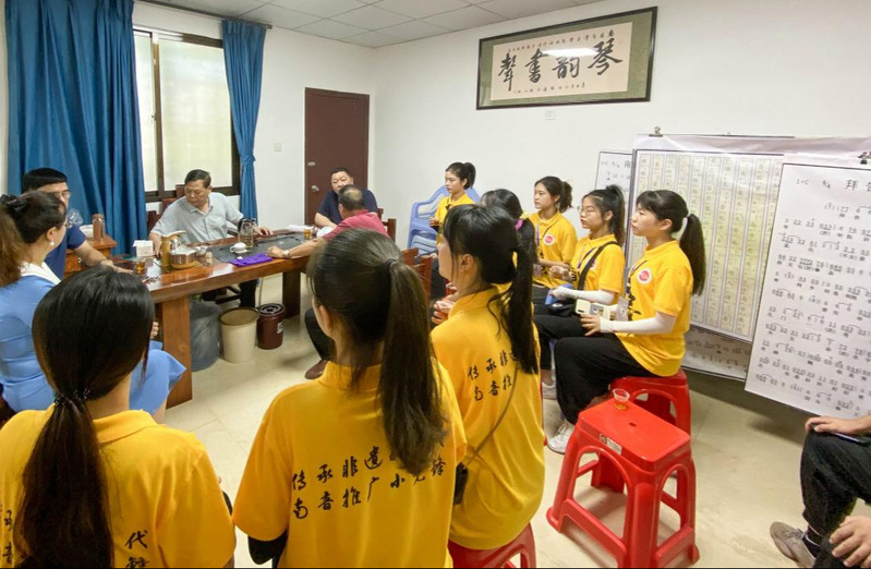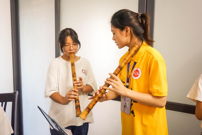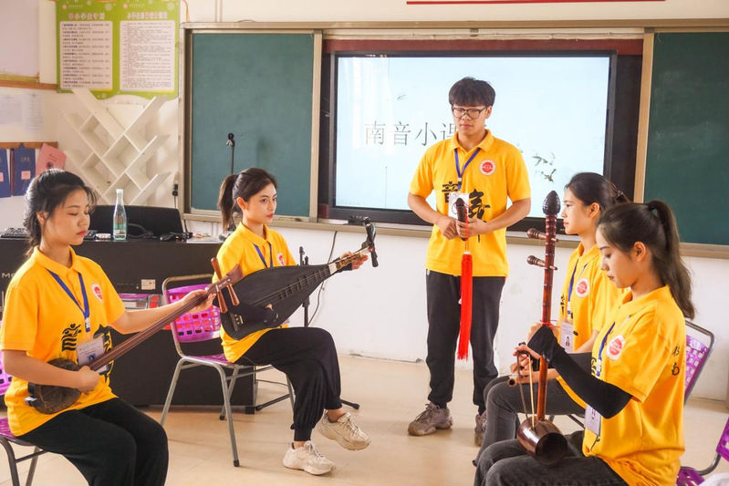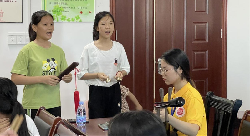 在面向近50名学员的为期一周的南音公益课堂中,实践队针对每位学员的学习基础,量身打造了理论课、声乐课、器乐课等课程,分为南琶班、二弦班、洞箫班、唱腔班四个小班进行教学,将孩子们的南音学习进一步系统化、科学化。南音系的研究生为小学员们生动地讲解了南音史论的部分知识,增加了孩子们对南音历史的了解;实践队以分组教学的形式带领孩子们细致学习南音中的工乂谱,队员们首先将“乂”“工”“六”“甲”“一”五个基本音以讲解加以琵琶伴奏的方式将工乂谱的看谱方式及唱法教给小学员们,后以《棉答絮》一谱进行唱谱训练,让小学员们感到十分新奇,纷纷表示又学到了南音的一项基础技能;小老师们手把手地教授学员们南音四宝、四管的演奏方式及每种乐器的演奏技巧,加深了孩子们对南音演奏乐器的了解,开拓了小学员们的眼界。