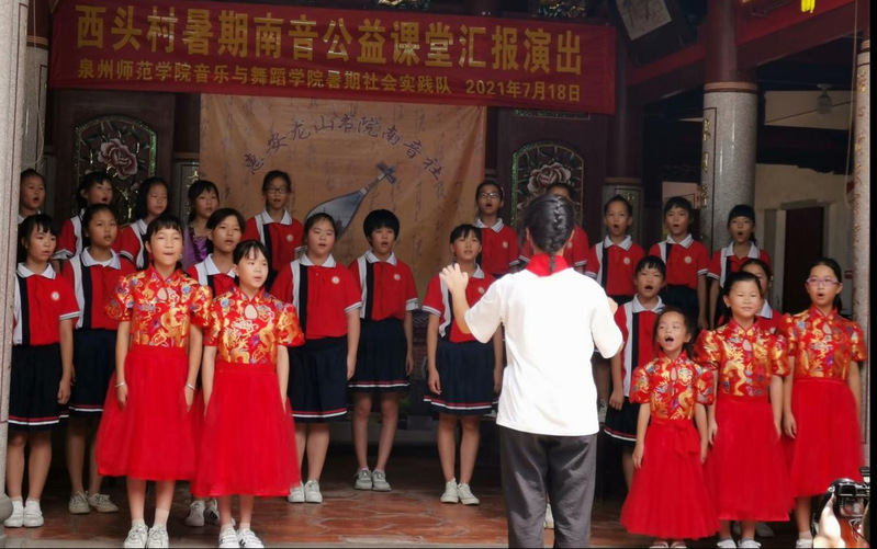 为期一周的音乐与舞蹈学院2021年“传承非遗新生代·南音推广小先锋”暑期社会实践活动暑期实践活动在圆满的汇报演出中落下了帷幕,在这段难忘的时光里,队员与学员们相互学习、相互磨合,收获了经验、收获了友谊,小学员们从最初对南音的一知半解到渐入佳境,再到在汇报演出中的从容和自信,充分感受到了南音这一中华优秀传统文化的博大精深,也树立了传承、弘扬优秀传统文化的决心。相信今后经过校地共同的深耕细作后,西头村这片南音发展的美好沃土上,定会结出南音传承最美的果实。