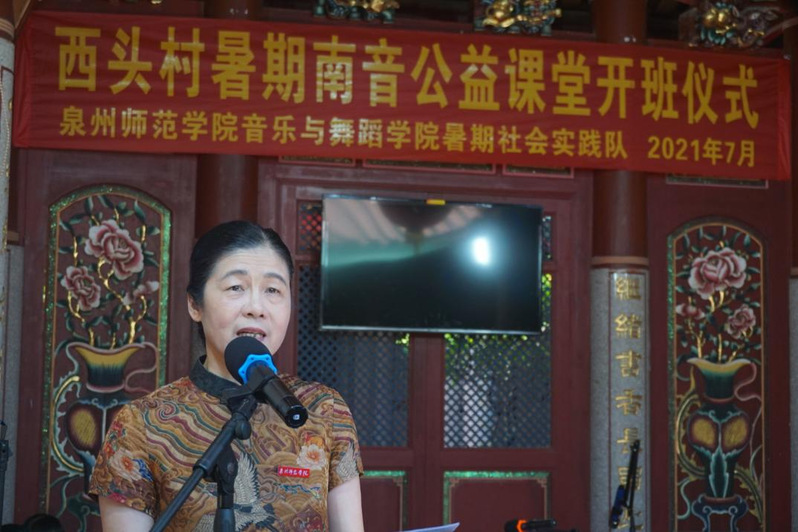 在7月13日的开班仪式上,原校党委副书记现泉州市教育基金会副理事长张舟、校团委书记刘显新、院党委书记苏国柱、南音系主任白志艺、惠安县关工委刘忠民主任、净峰镇党委组委吴泽祺等领导莅临关心指导,西头村党支部书记张钦强致欢迎辞,音乐与舞蹈学院院长王丹丹作讲话,并向西头村授予“泉州师院专业实践基地”。王丹丹院长嘱托实践队队员们通过本次社会实践活动向西头村的南音前辈们虚心请教、认真学习,在实践中熏陶思想、提升品德、增长才干、将所学专业知识教授予新一代南音文化传习者,获得丰富的教学、实践经验,身体力行地传承世界非遗、中华优秀传统文化——南音,并创新性地推广南音,希望丰富多彩的公益课堂和公益宣传活动能助力西头村的文化建设、为新农村建设、乡村振兴增光添彩。