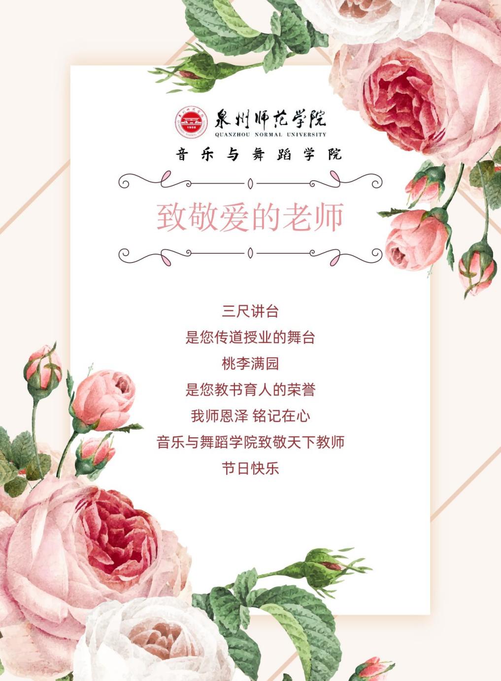 阳光普照,园丁心坎春意浓;甘雨滋润,桃李枝头蓓蕾红。一声老师,一生老师。音乐与舞蹈学院全体学生祝愿所有老师平安健康、教师节快乐!