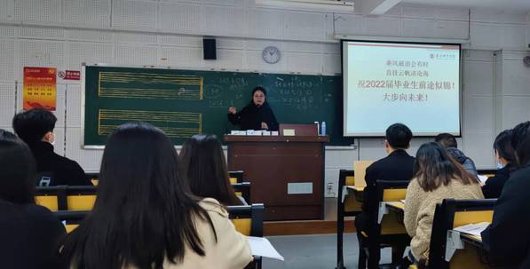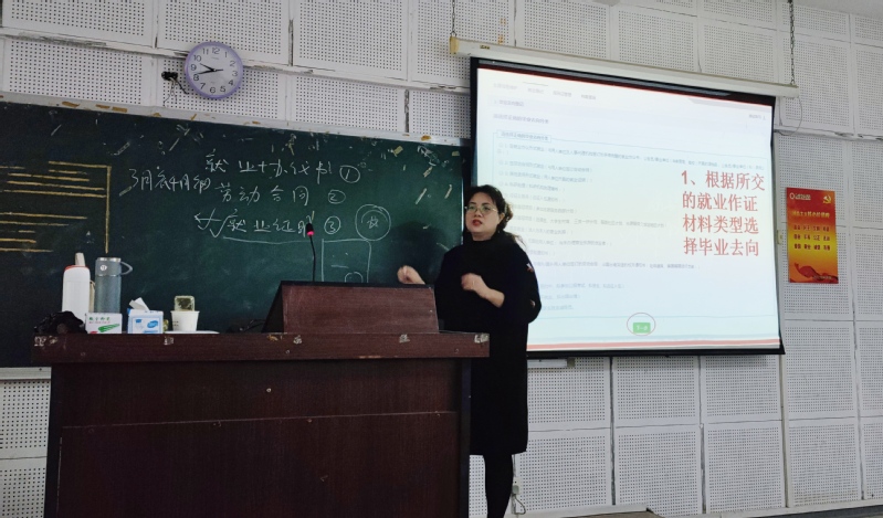 会上,刘晓莹就普通高等学校毕业生就业协议书、就业推荐表、人事档案去向等事项做详细说明,并针对近年就业形势为在座同学进行分析,帮助他们形成具体的求职认识,走出慢就业的误区,积极就业。
