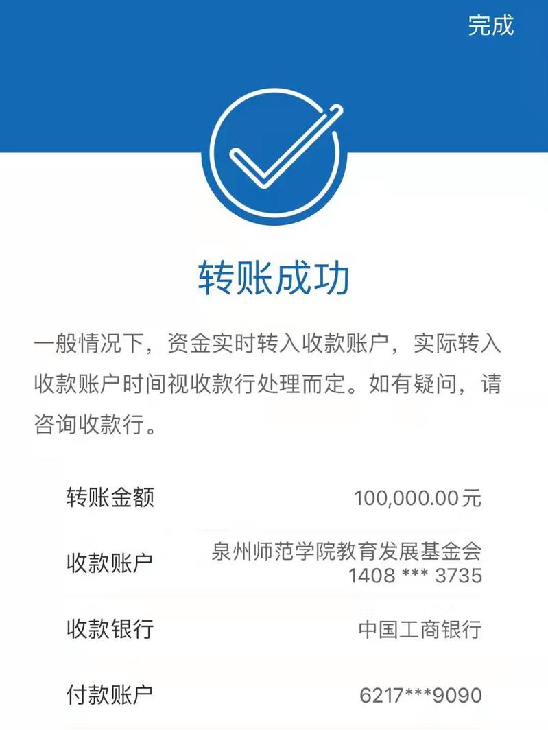 4月2日,音乐与舞蹈学院2019级音乐学(闽台合作)学生吴剑铫家长以转账方式,向开云kaiyun官网教育发展基金会账户捐款人民币100000元用于支持音乐与舞蹈学院抗疫工作。