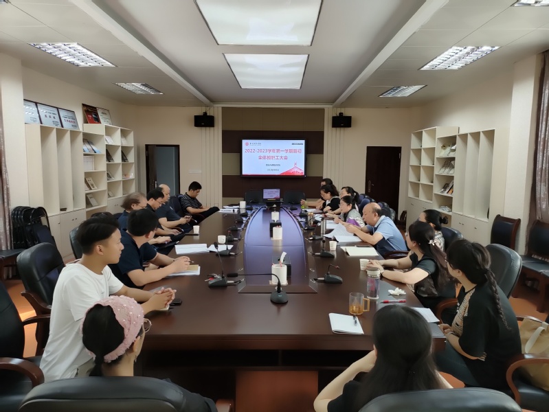 9月5日下午,我院在艺术楼C205会议室以线上线下相结合方式召开秋季学期期初教职工大会,部署新学期工作。院长王丹丹、党委书记苏国柱、党委副书记兼纪委书记胡秋娇、副院长吴少静、副院长翁世晖出席线下会议,全体教职工参加会议,胡秋娇主持会议。