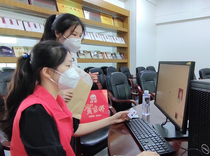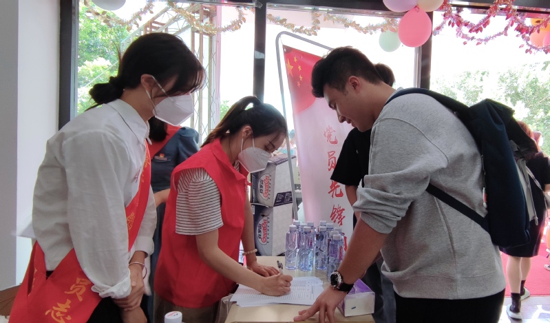 学生党员在党员先锋岗上,热情地为新生分发“新生大礼包”、饮用水并耐心地介绍报到注册流程。