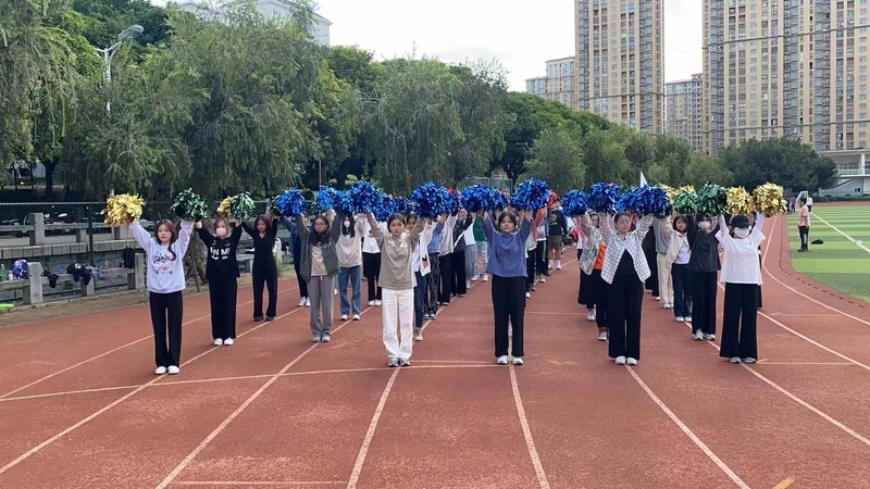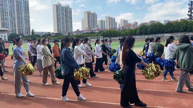 为迎接第40届校田径运动会,音乐与舞蹈学院组织学生们进行开幕式的方阵训练。