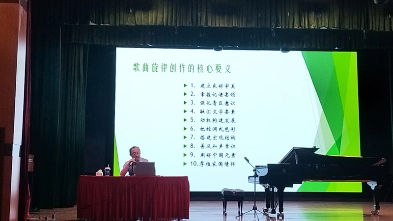 胡廷江教授指出旋律创作的核心要义分别是:建立良好审美、掌握记谱要领、强化音区意识、融汇文学要素、动机构建发展、把控调式色彩、搭建宏观结构、普及和声常识、用好中国元素、厚植家国情怀等十个方面。并以《彩云追月》等曲目为例为师生逐句进行分析比对传统和创新创作的不同之处;结合《爱莲说》《玫瑰三愿》等作品分析“歌词”与“旋律”之间碰撞的魅力,分享自身音乐创作感受。