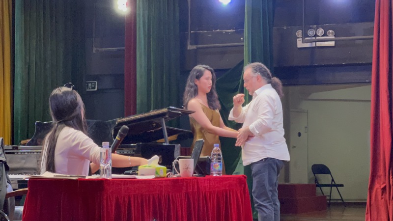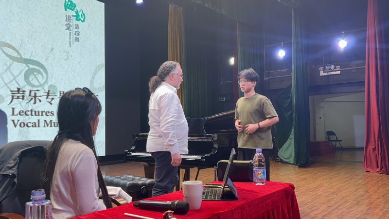 Francesco Zingariello教授以声乐艺术为主题,讲述美声唱法与歌剧的由来,分享意大利声乐的基本技法,并对具体声乐作品进行解析。在讲座过程中开展了现场教学,从意大利语发音、歌唱气息共鸣、曲式结构和作品诠释等方面对学生进行一对一的耐心指导。