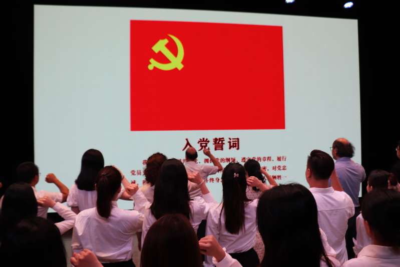 宣誓仪式在雄壮的《国际歌》中拉开帷幕。在学院党委书记苏国柱的领誓下,全体新党员面向鲜红的党旗,庄严地举起右手,向党旗宣誓。铮铮誓言,表达了对党的无限忠诚和为党的事业奋斗终生的坚定信念。