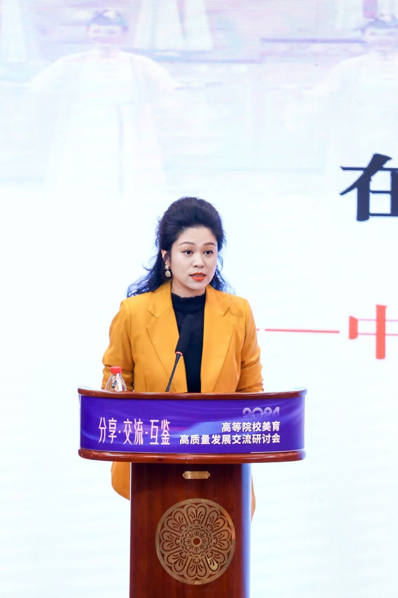 研讨会上,陈恩慧应中国音乐家协会高校音乐联盟的邀请,发言了题为“在传承发展中实现美育浸润——中国优秀传统文化南音传承基地建设”的报告,向与会嘉宾详细介绍了我院南音传承基地作为全国教育部首批传统文化传承基地之一,在南音课程学习、多元实践和科研成果方面如何实现美育的浸润。她深入浅出地阐述了南音作为学院美育浸润的载体,不仅培养了学生对传统文化的尊重和热爱,还丰富人才培养的课程体系,为学生提供了美育实践和文化传承的重要平台。