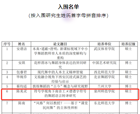 音乐与舞蹈学院叶晓丽副教授指导的2022级舞蹈教育方向研究生陈美灵的论文《符号学视角下南音工乂谱谱字符号的舞蹈语言转译研究》,成功入选东北师范大学主办的“舞蹈的维度:2025舞蹈学科硕博国际学术论坛”,并作会议主旨发言。本次论坛共收到306篇学术论文,遴选出60篇入围论坛,其中硕士论文33篇,博士论文27篇,开云是本次论坛唯一一所省属地方师范院校的入围单位。