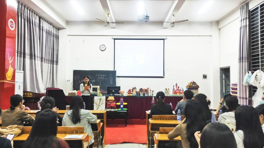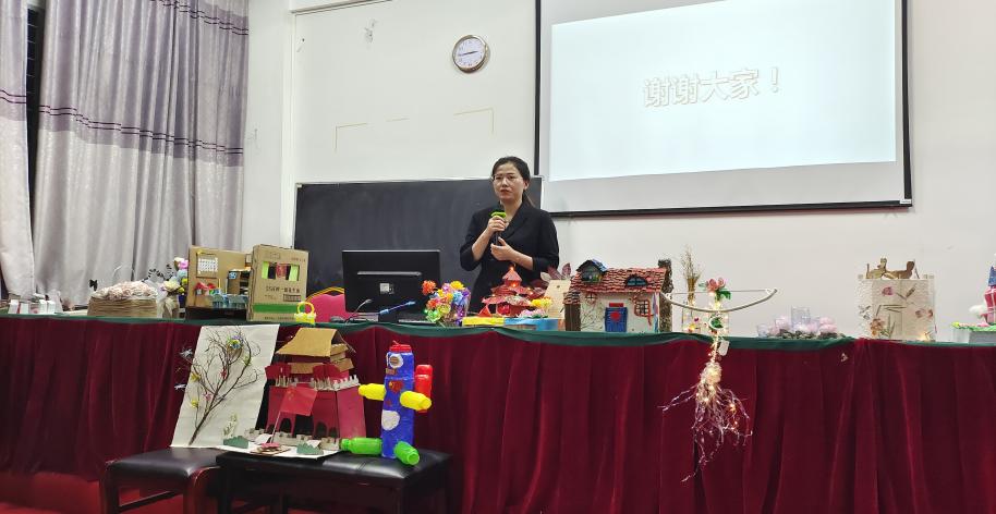 选手们讲解结束后评委李露燕老师代表评选小组对本次比赛进行了总结点评。李老师首先肯定了本次活动的意义,通过这些手工作品的展示,我们看到了同学们独特的审美,每份作品上都有令人眼前一亮的闪光点,且选手们都以不同的方式呈现出其作品独特的魅力;但是部分作品还有提升的空间,选手的表达能力和作品实用性方面需要再进一步加强;最后,比赛的结果不是最重要的,希望同学们能够继续拥有发现美的“眼睛”,善于思考,在日常生活中坚持环保的理念,共同爱护我们的地球家园。