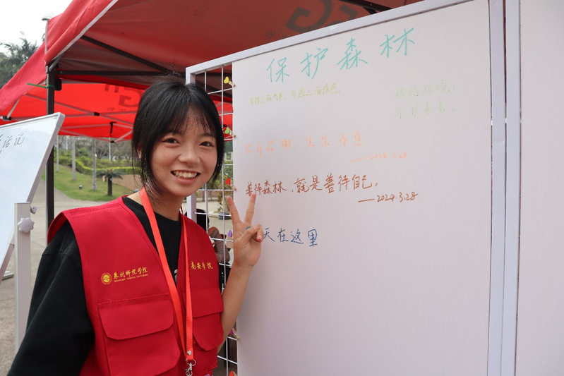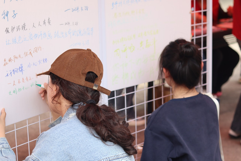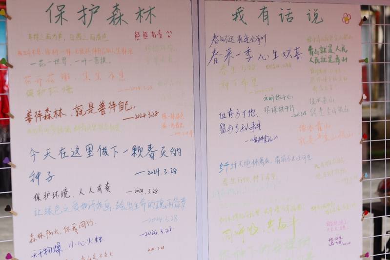 在“保护森林,我有话说”活动中,活动现场参与者在kt板上留言,积极表达对森林的关爱与保护,在书写的过程,同学们的签名与寄语汇聚成一种集体的声音,展现了大家对环保的坚定立场与共识,唤起了对自然的敬畏与爱护之情,同时也增强了他们对环境保护的责任感。