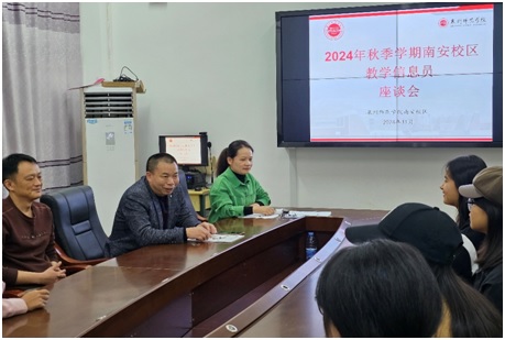 11月20日下午,南安学院召开南安校区学生教学信息员座谈会。会议由教学科研办负责人林让起老师主持,出席会议的有南安校区管委会副主任、南安学院副院长陈丽娥,保卫科林钦东老师,以及南安校区2023、2024级各班学生教学信息员。
