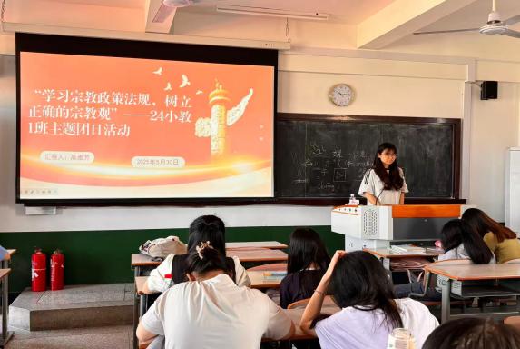 24英语1班、2班通过观看宣传片开场,团支书及团员骨干解读《宪法》《宗教事务条例》,强调团员不得信教的纪律要求,倡导科学理性精神。最后团支书总结,要求团员持续学习、明辨是非,自觉维护校园稳定。